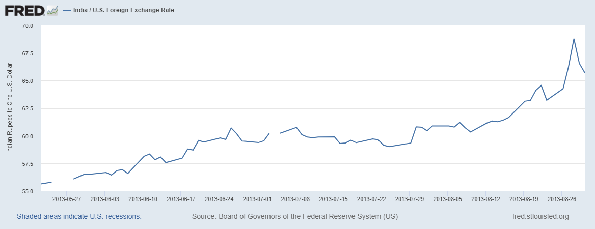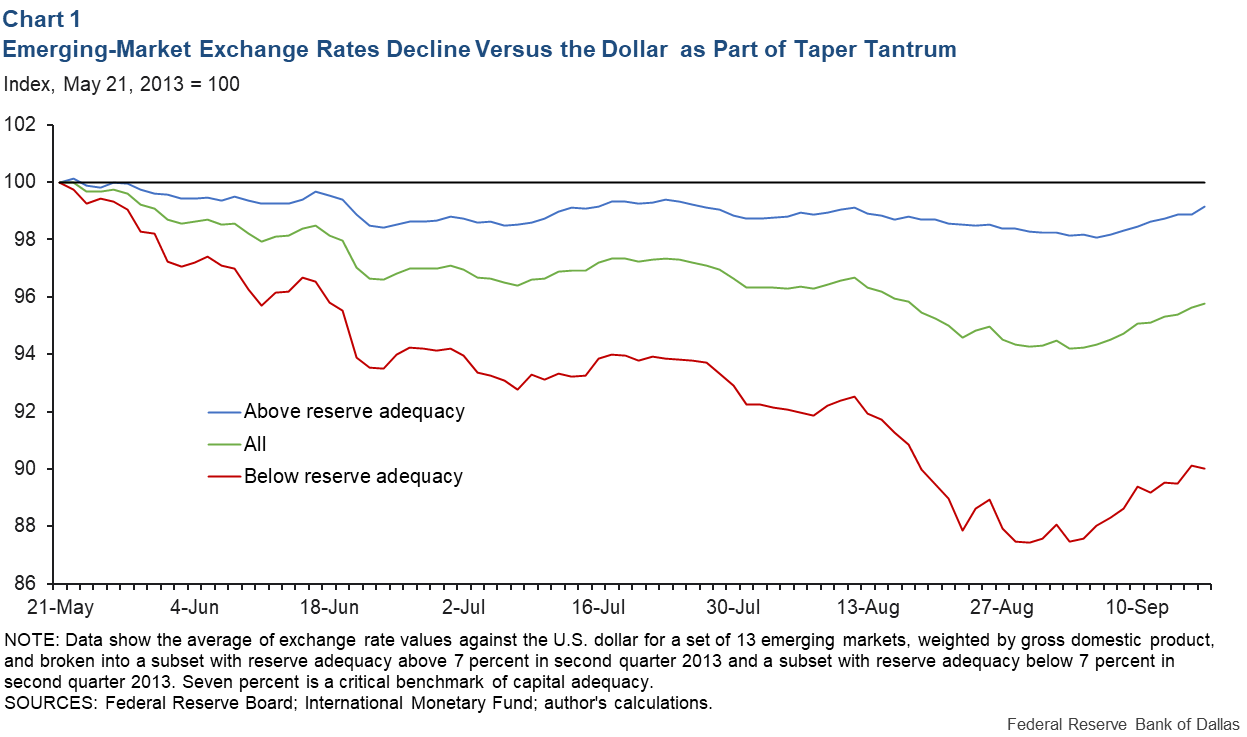 This announcement had a much larger effect on the emerging markets. The graph below by the Federal Reserve Bank of Dallas plots the exchange rate of a set of 13 large emerging-market countries w.r.t the USD. It is weighted by GDP and tracks the changes post the May 2013 announcement.