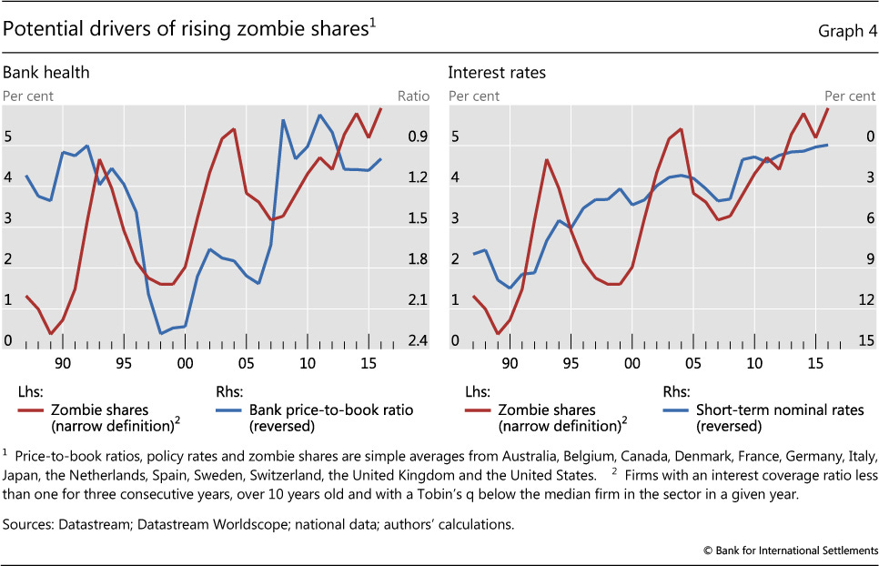 According to a report titled "The Rise of Zombie Firms: Causes and Consequences" published in the BIS Quarterly Review of September 2018, the presence of zombie firms lowers investment in and employment at productive firms. The publication uses firm-level data on listed firms in 14 advanced economies and documents an increase in the prevalence of zombies since the late 1980s. Their research notes that this increase is linked to the reduced financial pressure which in part reflects the effects of lower interest rates.