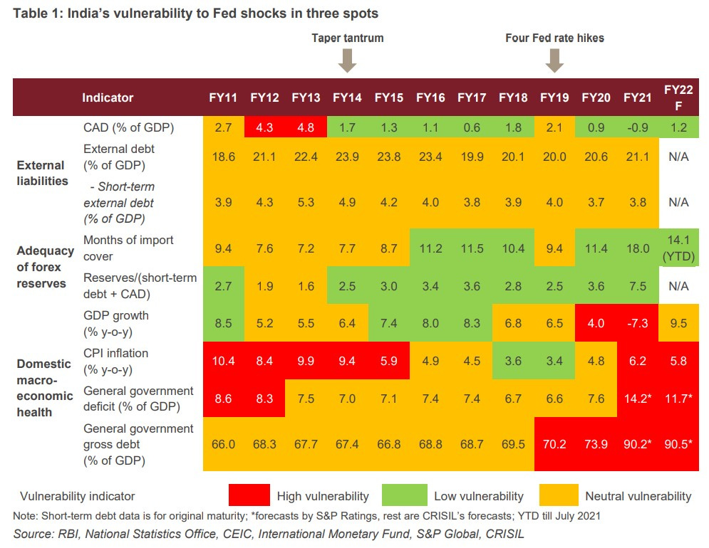 A report published by CRISIL notes similar observations. However, the report also notes that the domestic macros of India remain weak, though recovering. The GDP is moving towards the pre-pandemic levels, but the pace is slower as compared to other emerging markets. And there is also a high level of inflation along with high government debt. Here is a snapshot from the report highlighting the key vulnerabilities: